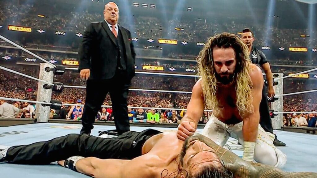As the match nears its climax, all three men are worn out. Punk fights valiantly, applying his Anaconda Vise and Go to Sleep, but neither Reigns nor Rollins stays down. Paul Heyman, caught in a moral dilemma between his loyalties to Punk, Reigns, and Rollins, makes a shocking move. He hands Punk a steel chair, only to uppercut him in the groin and turn on him.