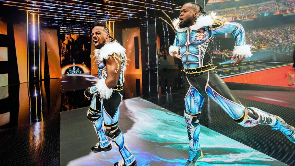New Day’s ring gear was inspired by the Giant Gonzalez, while War Raiders’ gear was inspired by Clash of Clans. The match began, and the first major moment came when Erik’s body slammed Ivar onto New Day at ringside. Ivar followed it up with a splash pressed on the apron screen. Erik attempted a suicide dive, but Kofi caught him with a right hand. Kingston and Woods targeted the neck of Erik. Kofi landed a knee strike, followed by Xavier’s double stomp.
